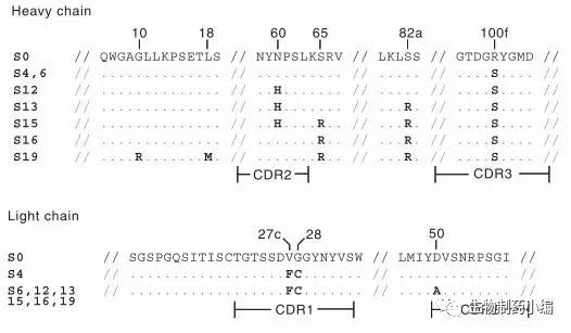隨后,他們對(duì)各批次的亞克隆細(xì)胞的V區(qū)基因做了序列比對(duì),找出了突變位點(diǎn),分析了抗體與靶點(diǎn)之間的構(gòu)效關(guān)系: